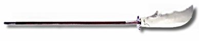 In Chinese it is properly called a yan yue dao (“reclining moon blade”) and has a heavy curved blade with a spike at the back and sometimes also a notch at the spike’s upper base that can catch an opponent’s weapon. The blade is mounted on top of a 5-6 ft long wooden or metal pole. With the blade being heavy it is useful for sweeping cuts that rely on range and power.